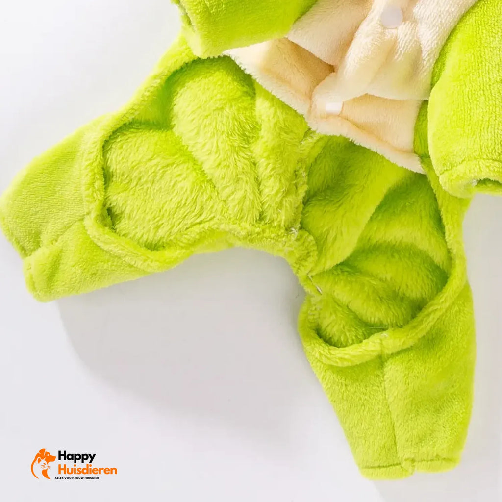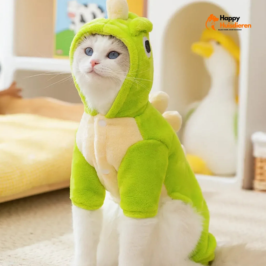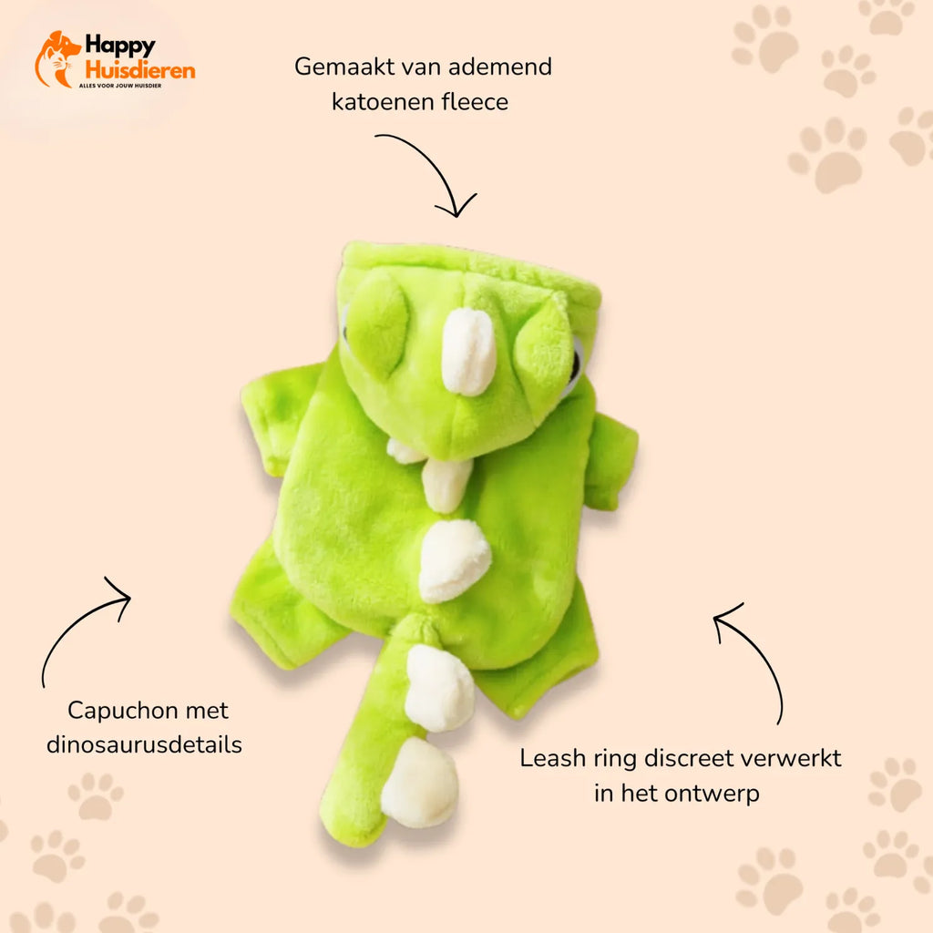 Transformeer je huisdier in een speelse dino met ons warme dinosaurus kostuum