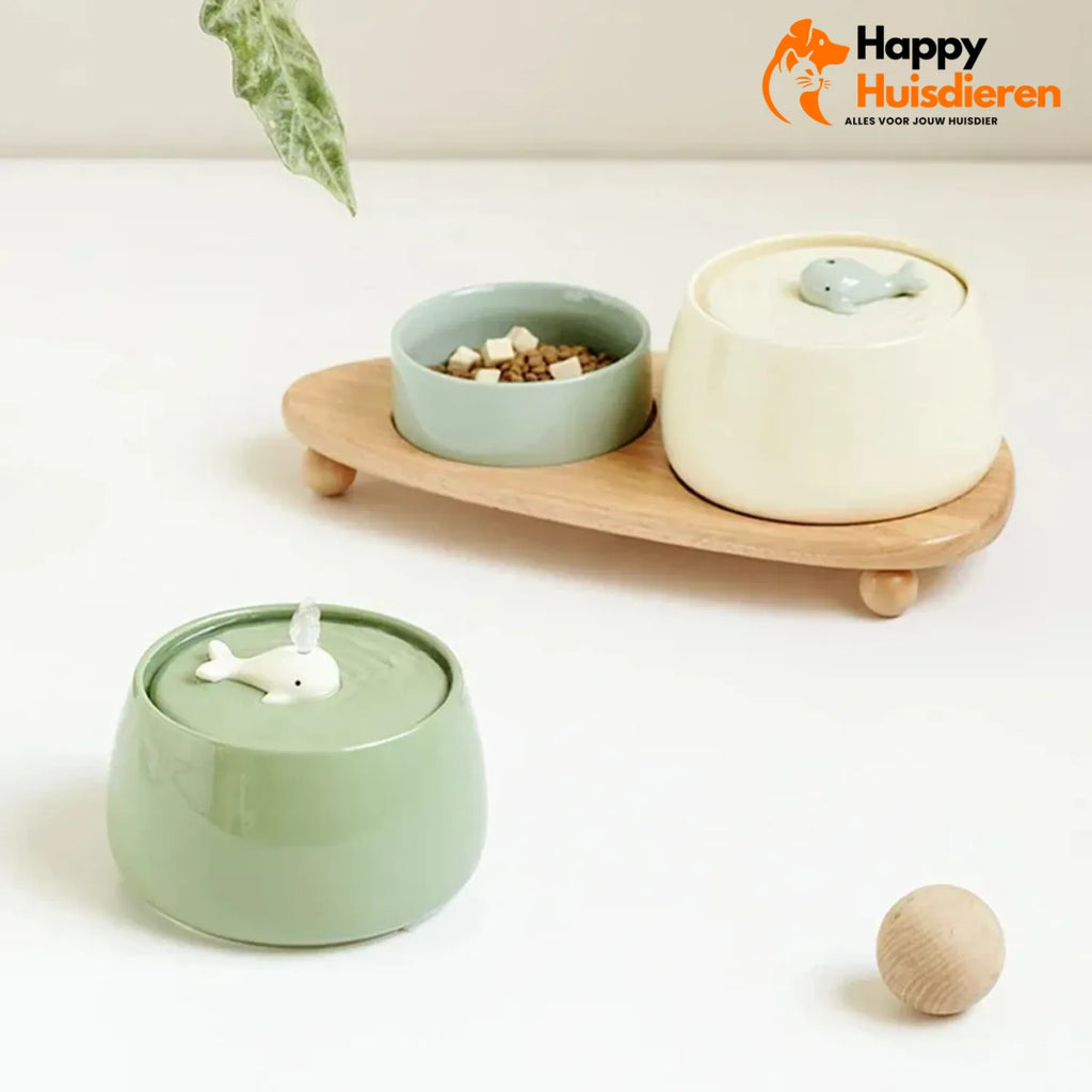 Verkrijgbaar in Groen of Beige keramiek, past de fontein naadloos in elk interieur. Een complete en duurzame oplossing – direct klaar voor gebruik.