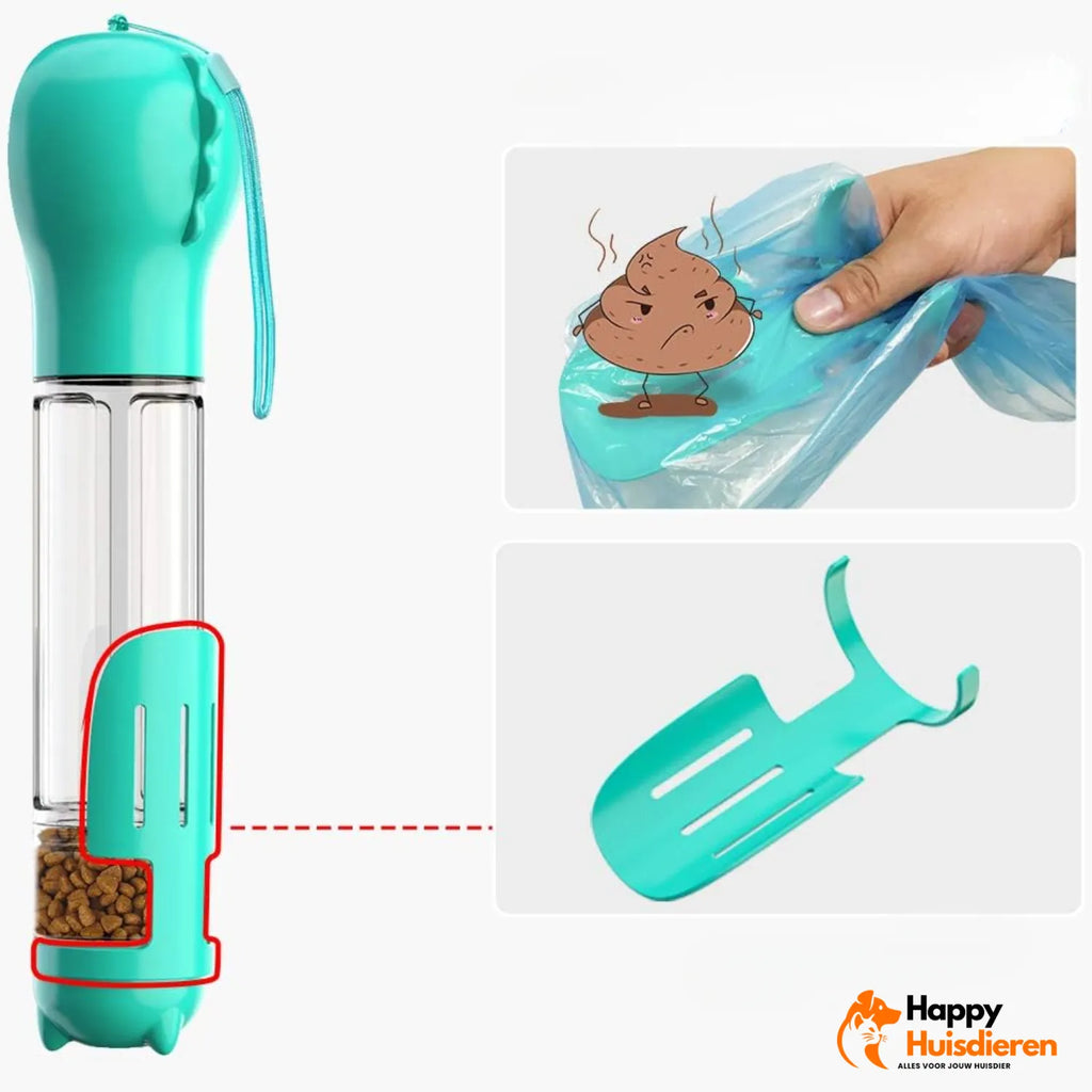 - Veelzijdigheid in één fles – Bevat een geïntegreerde waterfles, voederbak en poepzakjeshouder