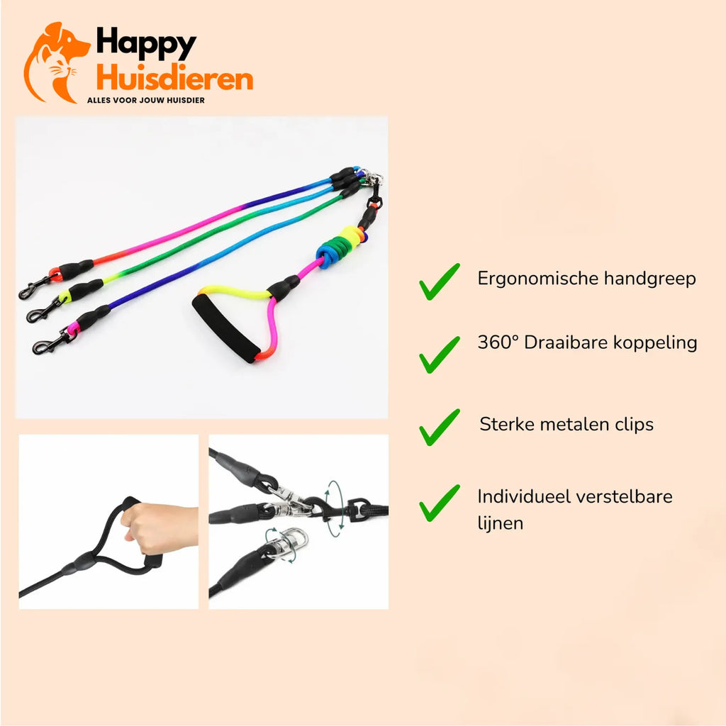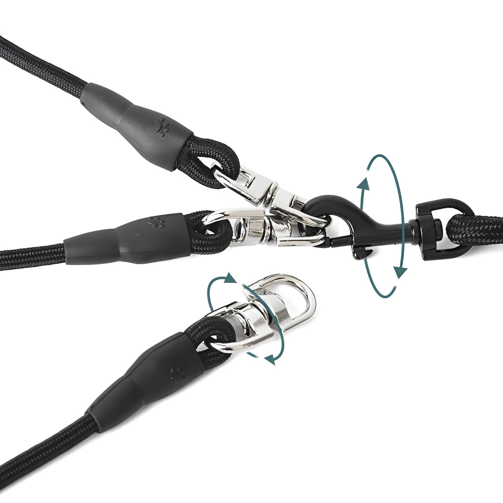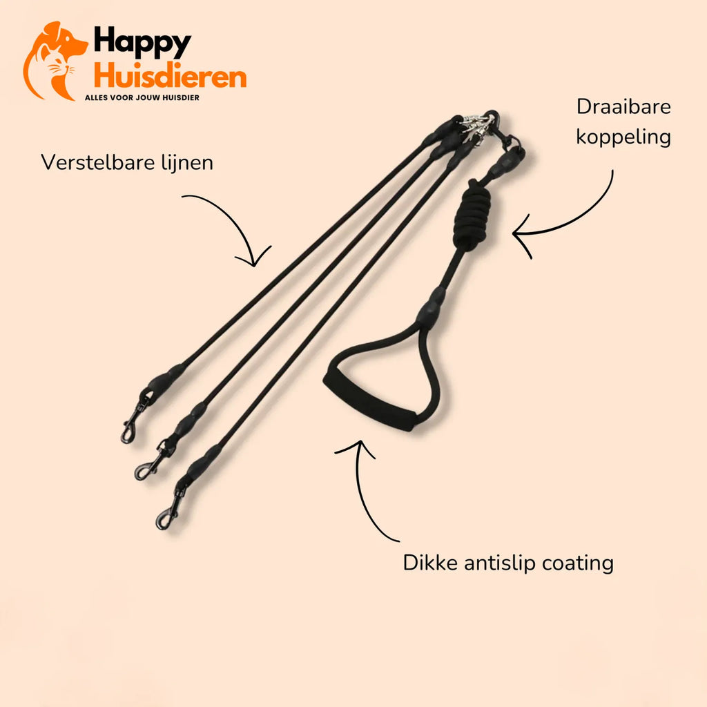 Onze VrijeKnoop hondenriem biedt een slimme oplossing voor wandeluitdagingen met meerdere honden.